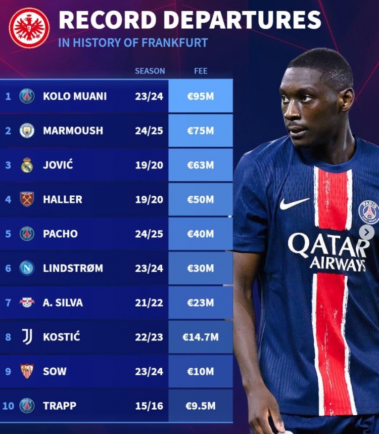 2025-03-02 02:33:54法蘭克福隊(duì)史賣人榜:穆阿尼&馬爾穆什領(lǐng)銜,約維奇&阿萊在列