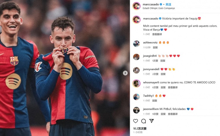 2025-03-03 08:52:08卡薩多社媒曬親吻隊徽照:非常開心能夠打進巴薩生涯處子球