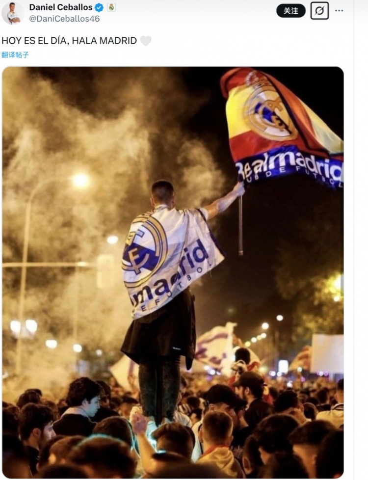 皇馬中場(chǎng)塞巴略斯更新社媒,曬出了一張身披皇馬隊(duì)旗的海報(bào),并配文寫道:“就在今天,加油皇馬!”