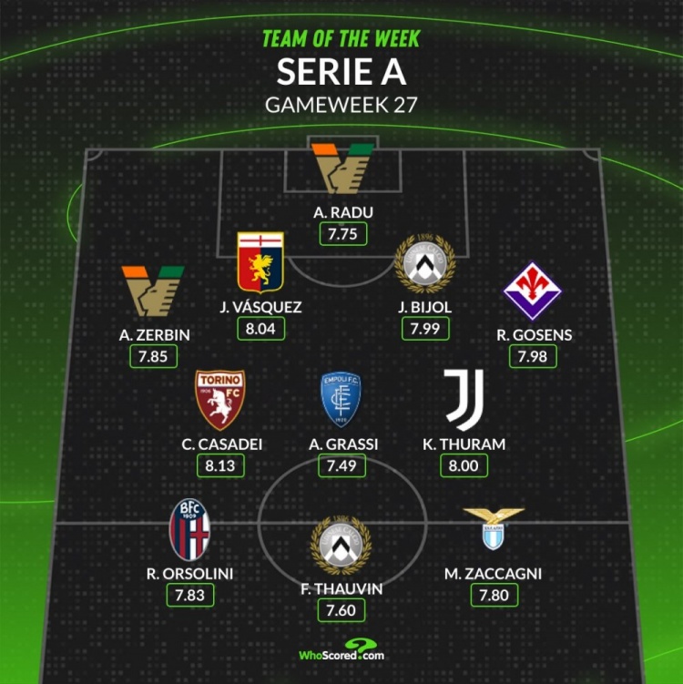 3月4日訊 意甲第27輪聯(lián)賽已經(jīng)完賽,whoscored也統(tǒng)計了本周意甲評分最佳陣容,凱夫倫-圖拉姆領(lǐng)銜。