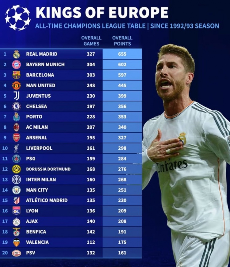 2月21日訊 歐冠淘汰賽附加賽已經(jīng)結(jié)束,《轉(zhuǎn)會市場》也統(tǒng)計(jì)了92-93賽季改制后的歐冠歷史積分榜,皇馬無懸念領(lǐng)跑。