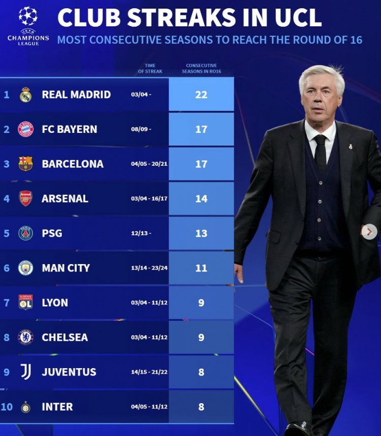 2月21日訊 皇馬在本輪歐冠附加賽雙殺曼城,成功挺進(jìn)歐冠十六強。《轉(zhuǎn)會市場》也統(tǒng)計了歐冠歷史最長連續(xù)晉級十六強榜單。