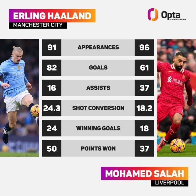 2025-02-21 17:50:31近3賽季哈蘭德vs薩拉赫英超數(shù)據(jù)對(duì)比:都參與98球,哈蘭德場次少