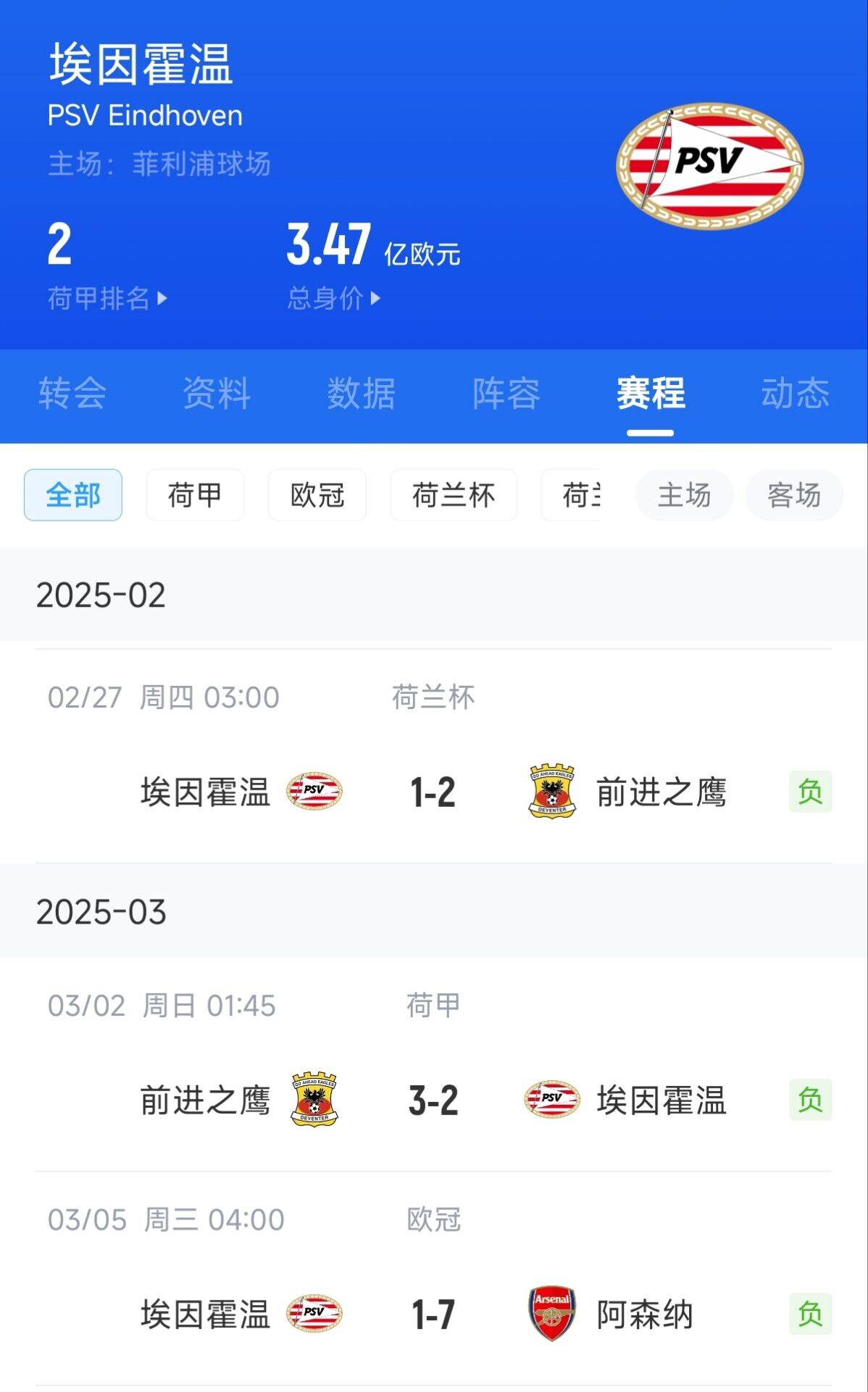 2025-03-05 11:22:10噩夢席卷而來!埃因霍溫一周內(nèi)荷杯出局&荷甲8分落后,歐冠被爆捶