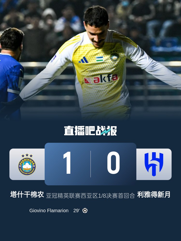 亞冠精英聯(lián)賽西亞區(qū)1/8決賽首回合,利雅得新月首回合0-1塔什干棉農(nóng)。上半場,弗拉馬里昂撞射破門,布萊希傷退;下半場,米林科維奇錯(cuò)失良機(jī),新月完成一次門線解圍。