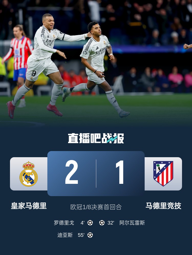 歐冠1/8決賽首回合,皇馬2-1馬競,占據(jù)晉級先機(jī)。上半場,巴爾韋德助攻羅德里戈內(nèi)切擺脫防守破門,阿爾瓦雷斯過掉卡馬文加后世界波扳平;下半場,卜拉欣-迪亞斯禁區(qū)內(nèi)蝴蝶穿花步過人后建功。