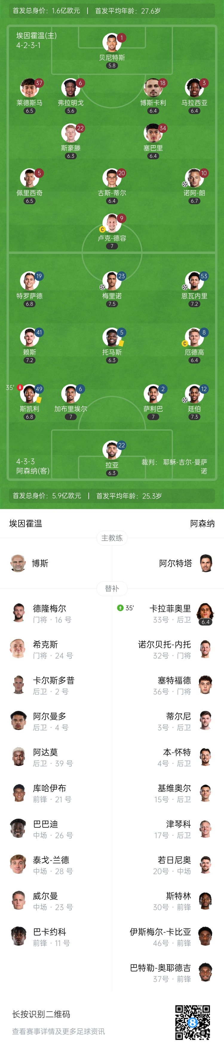 半場-阿森納3-1埃因霍溫 梅里諾建功 托馬斯送點斯凱利染黃被換下
