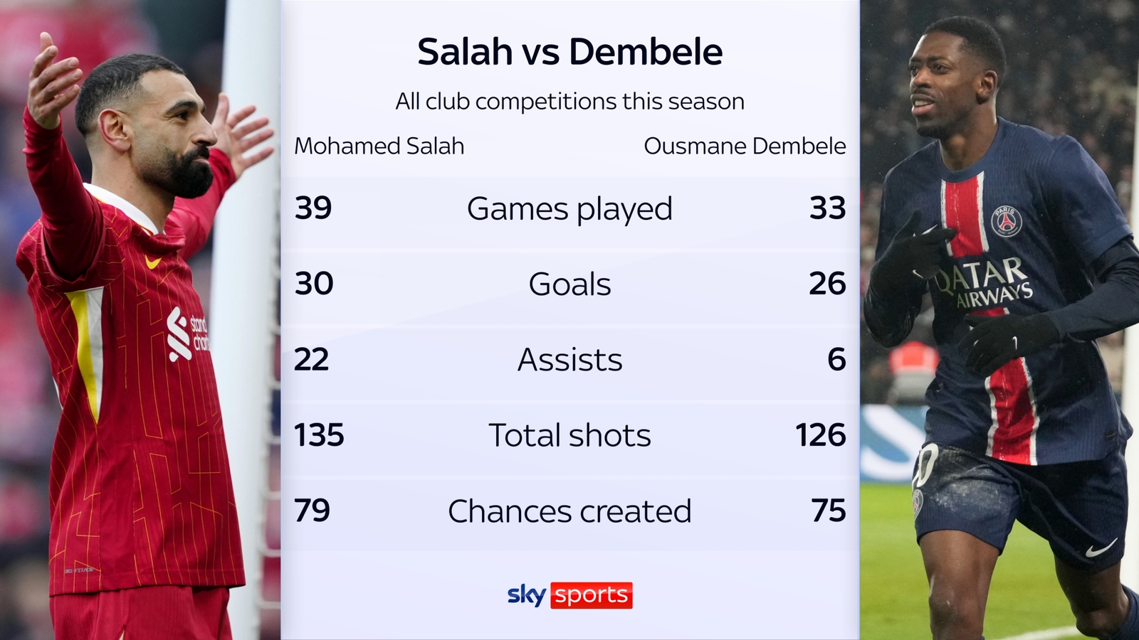 薩拉赫與登貝萊本賽季數(shù)據(jù)對(duì)比