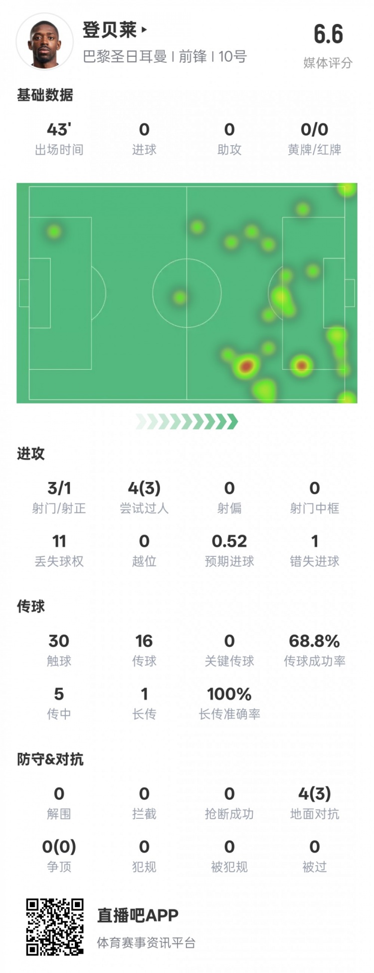2025-03-06 10:43:49登貝萊半場數(shù)據(jù):3過人成功11次丟失球權(quán)&錯失1進(jìn)球機(jī)會,評分6.6