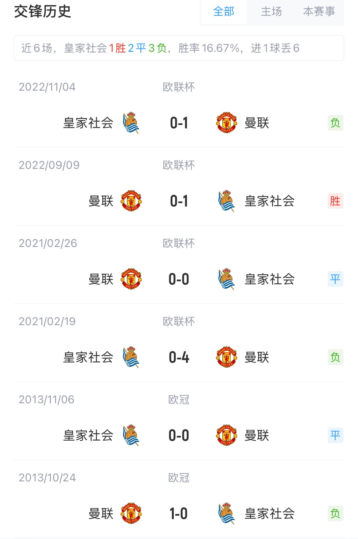 曼聯(lián)與皇家社會(huì)共交手過(guò)6次,曼聯(lián)3勝2平1負(fù)。此外,本賽季歐聯(lián)杯,曼聯(lián)目前是唯一一支不敗球隊(duì),他們聯(lián)賽階段5勝3平。