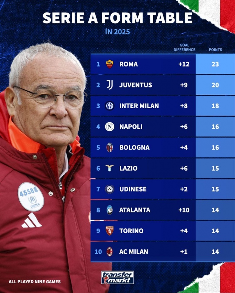 只手補(bǔ)天!2025意甲積分榜:羅馬23分居首,尤文20分、國(guó)米18分