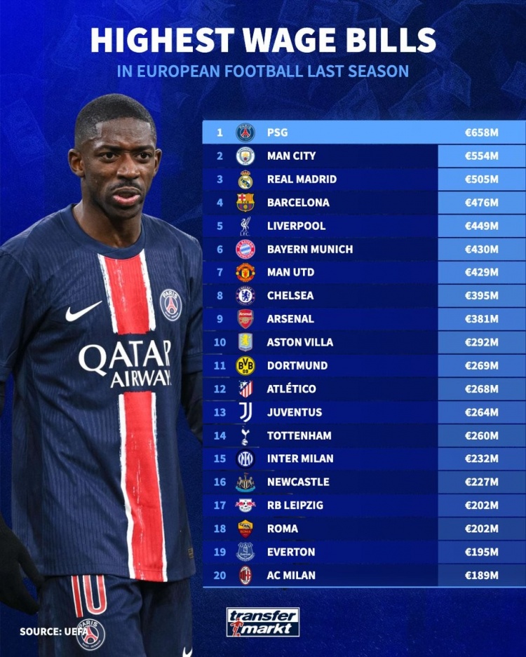 2025-03-07 23:49:07德轉(zhuǎn)列上賽季豪門薪資榜:巴黎6.58億歐,城皇薩軍仁魔車槍列前9