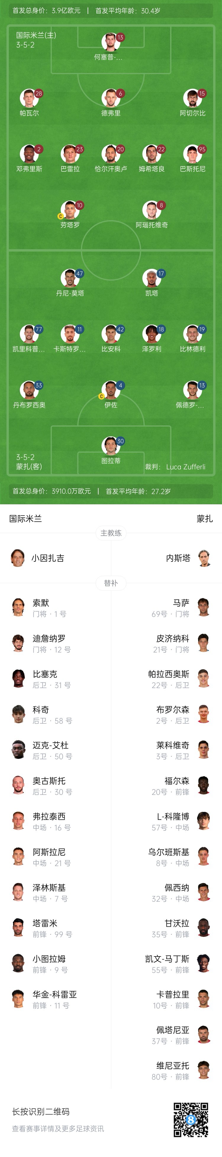 國米替補:1-索默、12-迪詹納羅、7-澤林斯基、9-圖拉姆、11-科雷亞、16-弗拉泰西、21-阿斯拉尼、30-奧古斯托、31-比塞克、50-艾杜、58-科基、99-塔雷米