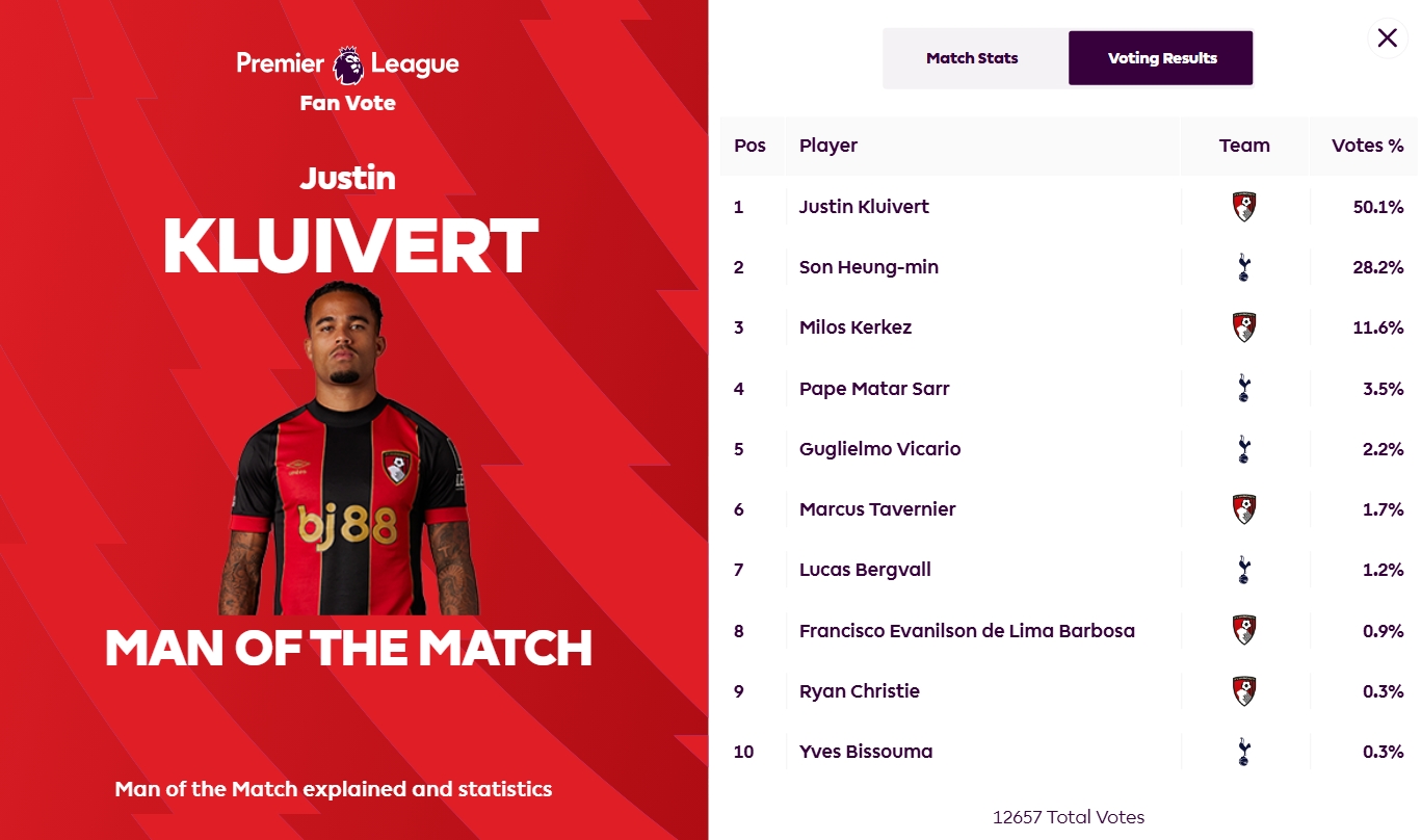 2025-03-10 06:07:09送出助攻!英超官方:小克魯伊維特當選伯恩茅斯2-2熱刺全場最佳