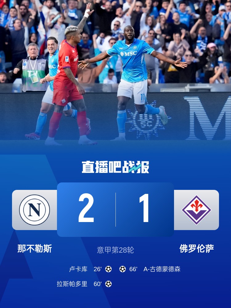那不勒斯2-1擊敗佛羅倫薩,取得近6輪首勝,盧卡庫(kù)、拉斯帕多里破門。