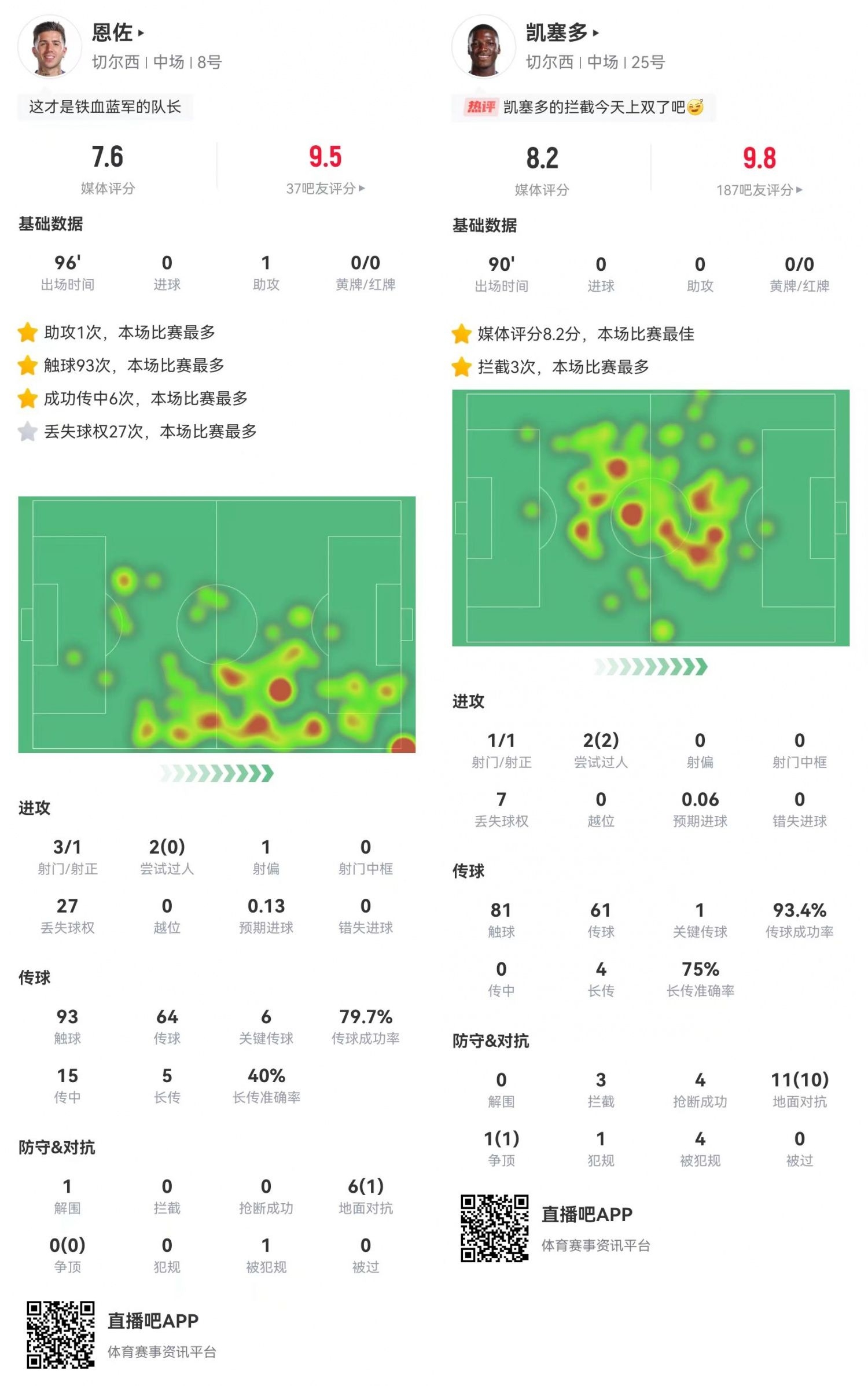 本場比賽恩佐與凱塞多的發(fā)揮可圈可點?!皣L試助攻王”恩佐總算“撿”到一個助攻,庫庫雷利亞的制勝球便是由恩佐傳導(dǎo)。凱塞多則繼續(xù)自己的戰(zhàn)神級發(fā)揮,本場比賽貢獻(xiàn)12次對抗11次成功,還有3攔截4搶斷0被過的鐵閘表現(xiàn)。切爾西的雙腰進(jìn)可攻退可守,正是藍(lán)軍本賽季戰(zhàn)績不錯的原因之一。