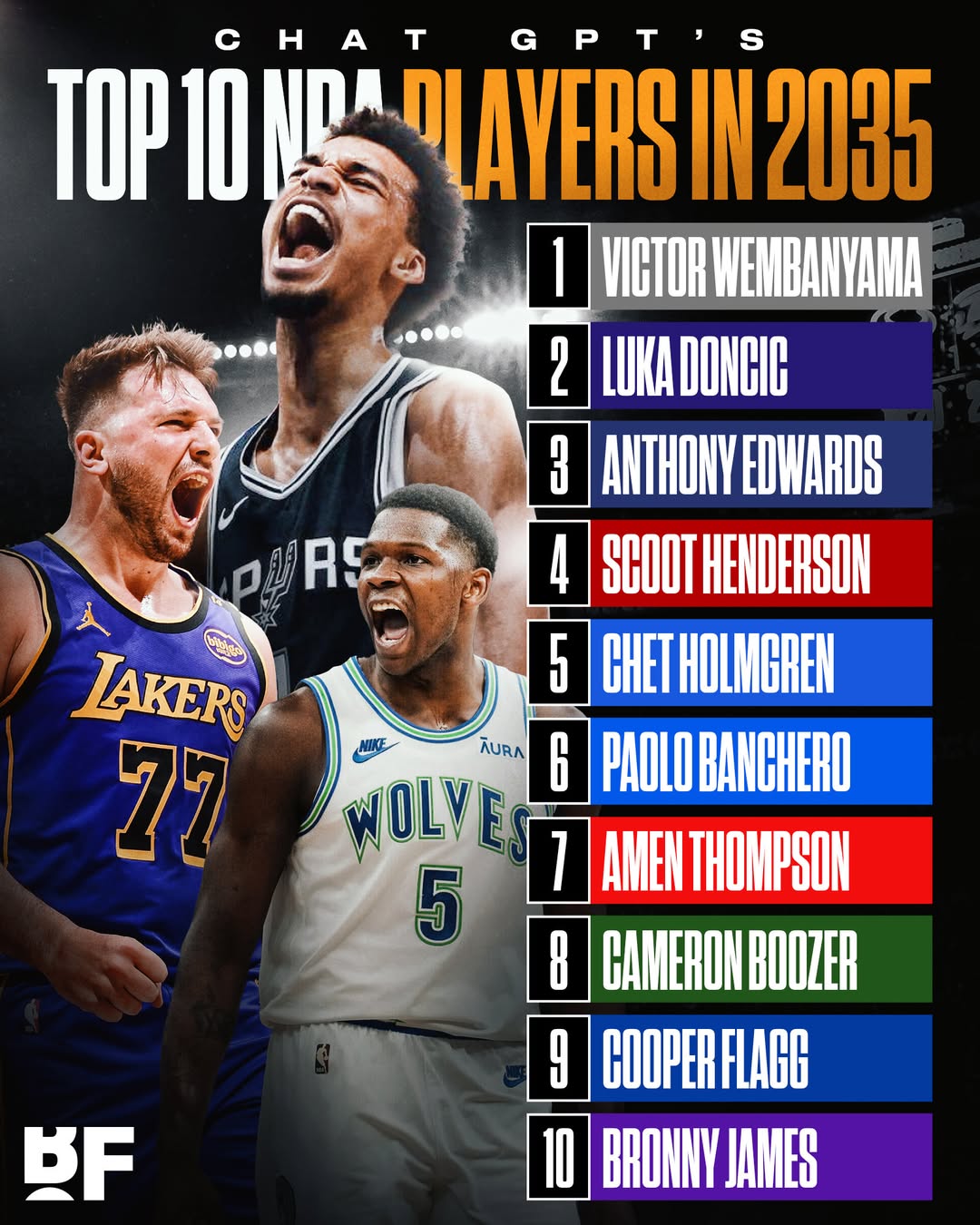 2025-03-13 00:38:31ChatGpt預(yù)測十年后前十球員:文班第一 東契奇第二 布朗尼第10