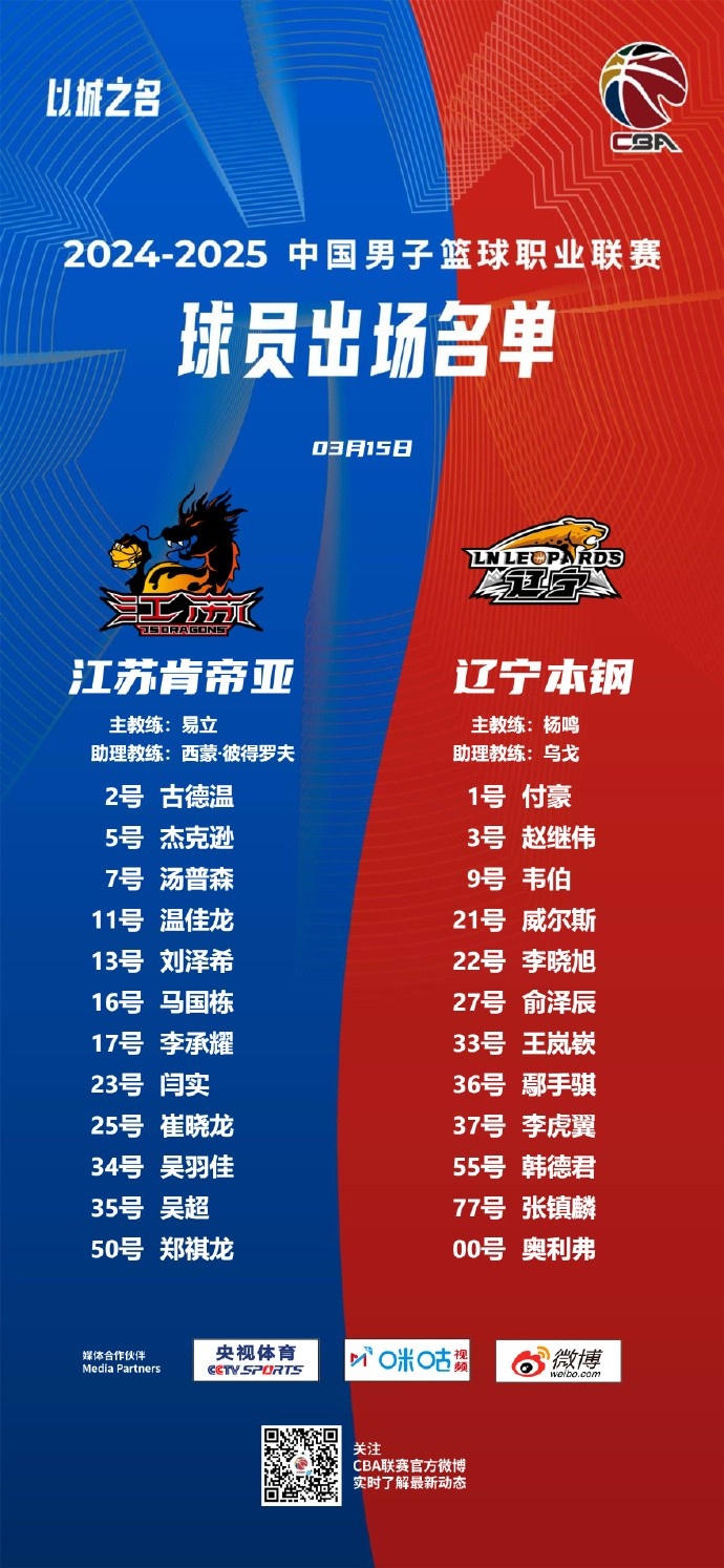 2025-03-15 21:05:16遼寧VS江蘇大名單:弗格缺陣 趙繼偉&張鎮(zhèn)麟領(lǐng)銜 俞澤辰在列