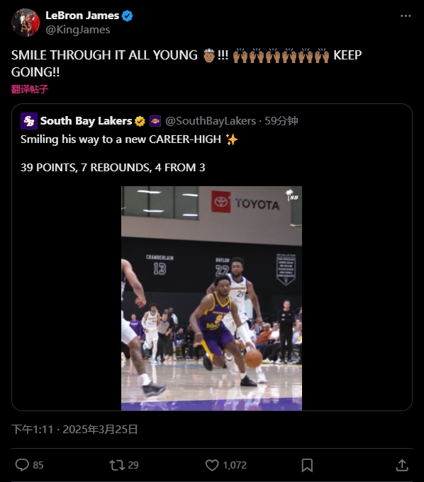 2025-03-25 18:04:51笑逐顏開!詹姆斯表揚(yáng)布朗尼:保持微笑&繼續(xù)前進(jìn)!加油王子!
