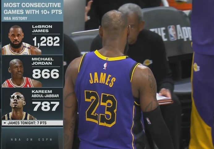 2025-03-27 20:57:01雖遲但到!詹姆斯第四節(jié)開局連得8分連續(xù)1283場比賽得分上雙!