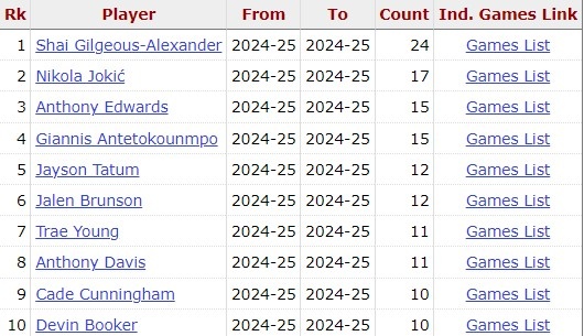 2025-03-28 14:02:39行走的得分機(jī)器!亞歷山大本賽季第25場(chǎng)35+ 其余人最多17次