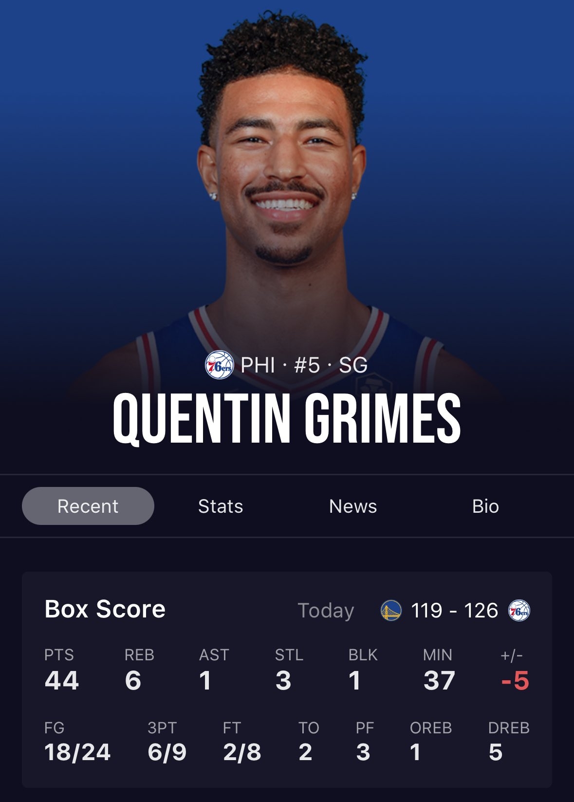 此役,76人后衛(wèi)、獨(dú)行俠舊將格萊姆斯表現(xiàn)神勇,他上場(chǎng)36分43秒24投18中,三分9中6、罰球8中2,砍下44分創(chuàng)生涯新高,還有6籃板1助攻3搶斷1封蓋進(jìn)賬。