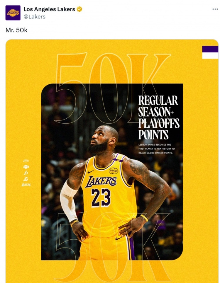 2025-03-05 13:09:56詹姆斯生涯50000分!湖人官方曬照:五萬(wàn)分先生
