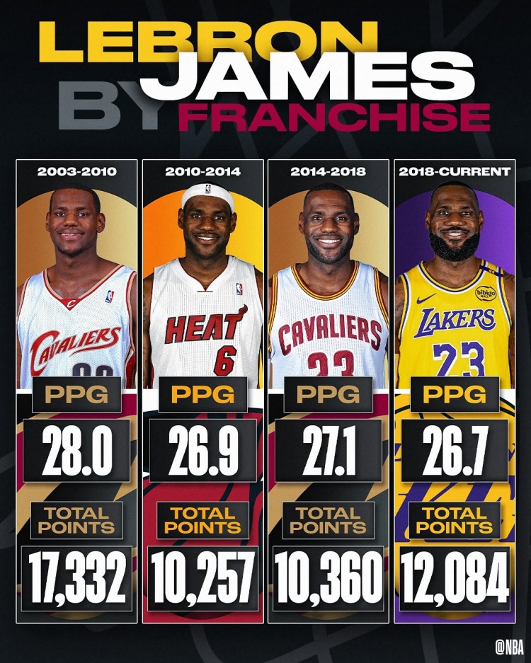 2025-03-07 15:47:56詹姆斯生涯四個(gè)階段總得分均破萬(wàn) 各階段場(chǎng)均得分差距不大