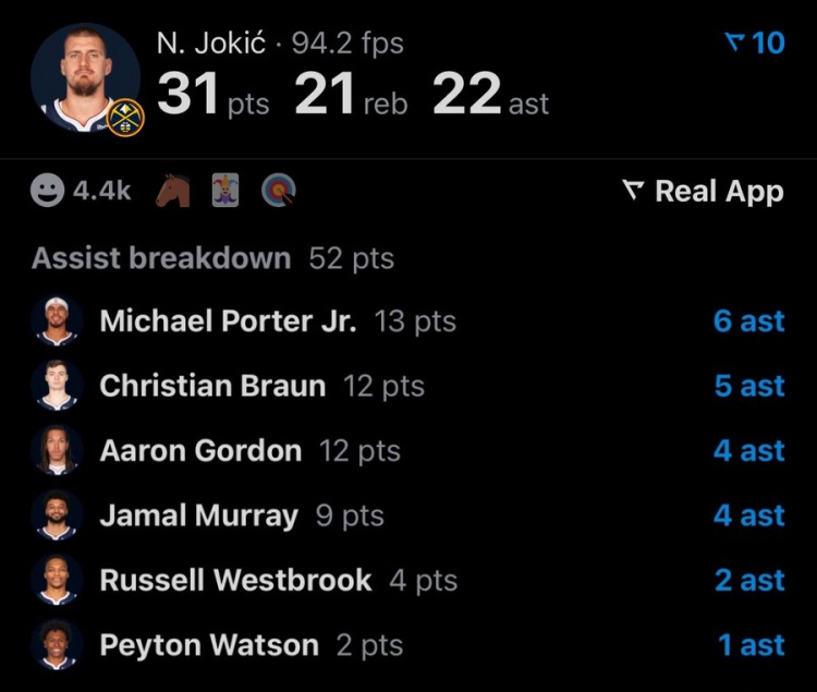 2025-03-08 21:30:50創(chuàng)造52分!約基奇22助攻分布:波特6次 布勞恩5 穆雷&戈登4 威少2
