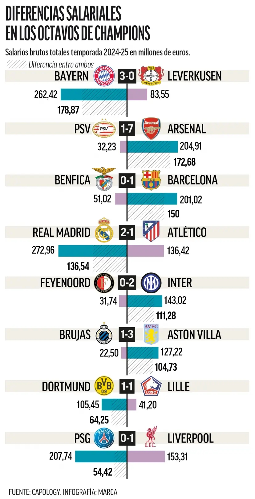 根據(jù)足球財務(wù)專業(yè)網(wǎng)站Capology的數(shù)據(jù),如果以球員薪資支出為標(biāo)準(zhǔn),最不平衡的淘汰賽是對陣拜仁和勒沃庫森的比賽,拜仁的薪資支出幾乎是對手的三倍(2.624億歐元對8350萬歐元)。第二大差距出現(xiàn)在阿森納與埃因霍溫的對決中,阿森納球員的2.049億歐元薪資遠(yuǎn)超埃因霍溫的3220萬歐元,差距高達(dá)六倍。第三個薪資差距較大的對決是本菲卡與巴塞羅那,巴薩球員的薪水是葡萄牙球隊的四倍(2.01億歐元對5100萬歐元)?;蜀R與馬競的陣容薪資差距恰好是兩倍,皇馬為2.729億歐元,馬競為1.364億歐元。