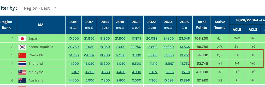 在泰山退賽情況下,目前中超球隊(duì)在亞冠賽場(chǎng)僅剩海港、申花兩隊(duì)爭(zhēng)取技術(shù)分。目前中國(guó)積分為54.682,身后泰國(guó)積53.748分虎視眈眈。一旦中國(guó)被泰國(guó)超越,那么26/27亞冠精英聯(lián)賽的名額將縮減為1+1。