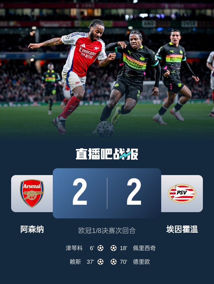 歐冠1/8決賽次回合,阿森納2-2戰(zhàn)平埃因霍溫,總比分9-3晉級八強。上半場,津琴科破門,佩里西奇扳平,賴斯頭球建功,斯特林送出2次助攻&錯失1次單刀球機會;下半場,德里歐挑射破門。