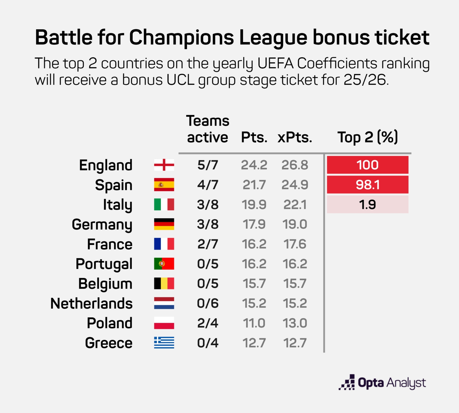 權(quán)威數(shù)據(jù)機(jī)構(gòu)Opta的最新超級計(jì)算機(jī)演算結(jié)果顯示,英超獲得第5個(gè)歐冠席位的概率已經(jīng)來到了100%,而西甲以98.1%的概率緊隨其后,意甲基本追分無望。