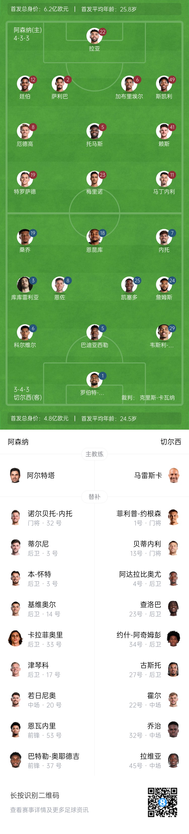 阿森納替補:32-內(nèi)托、3-蒂爾尼、4-本-懷特、15-基維奧爾、17-津琴科、20-若日尼奧、33-卡拉菲奧里、37-奧耶德吉、53-恩瓦內(nèi)里