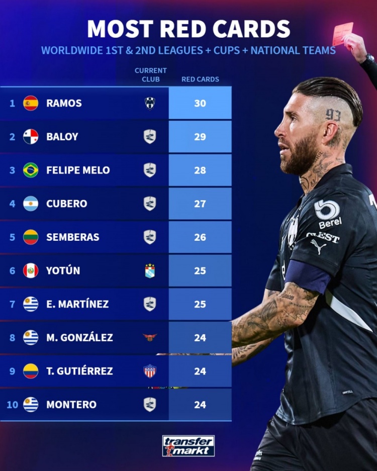 2025-03-18 21:13:34拉莫斯本輪聯(lián)賽踢人染紅,職業(yè)生涯至今吃到30張紅牌球員中最多
