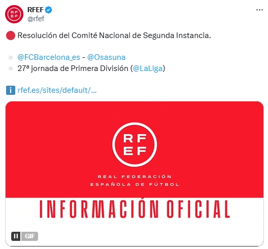 西足協(xié)表示,巴薩和奧薩蘇納均已損害競技利益的理由進(jìn)行上訴。但國家隊(duì)征召不構(gòu)成改期充分理由,只要俱樂部有足夠球員參賽即可。而巴薩和奧薩蘇納提議的日期均附加條件(如歐冠出局),可能引發(fā)賽程不確定性,違反賽程的“確定性原則”。考慮到奧薩蘇納vs畢爾巴鄂和vs巴薩的比賽僅相隔1天,西足協(xié)同意將奧薩蘇納vs畢爾巴鄂的比賽從28日改至30日。