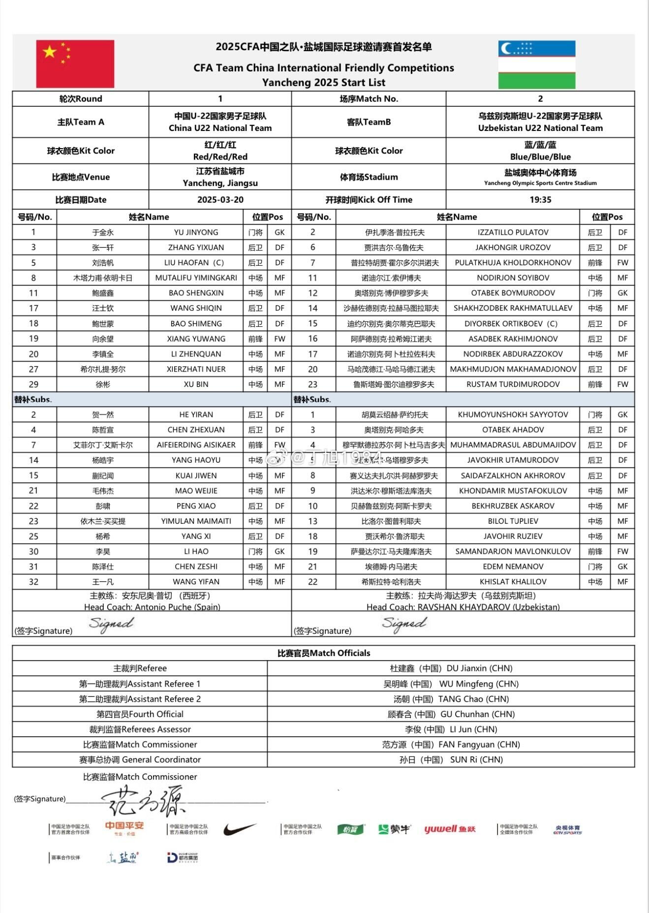 2025-03-20 23:19:13中國(guó)U-22男足VS烏茲別克斯坦U-22男足,中國(guó)隊(duì)首發(fā)名單出爐