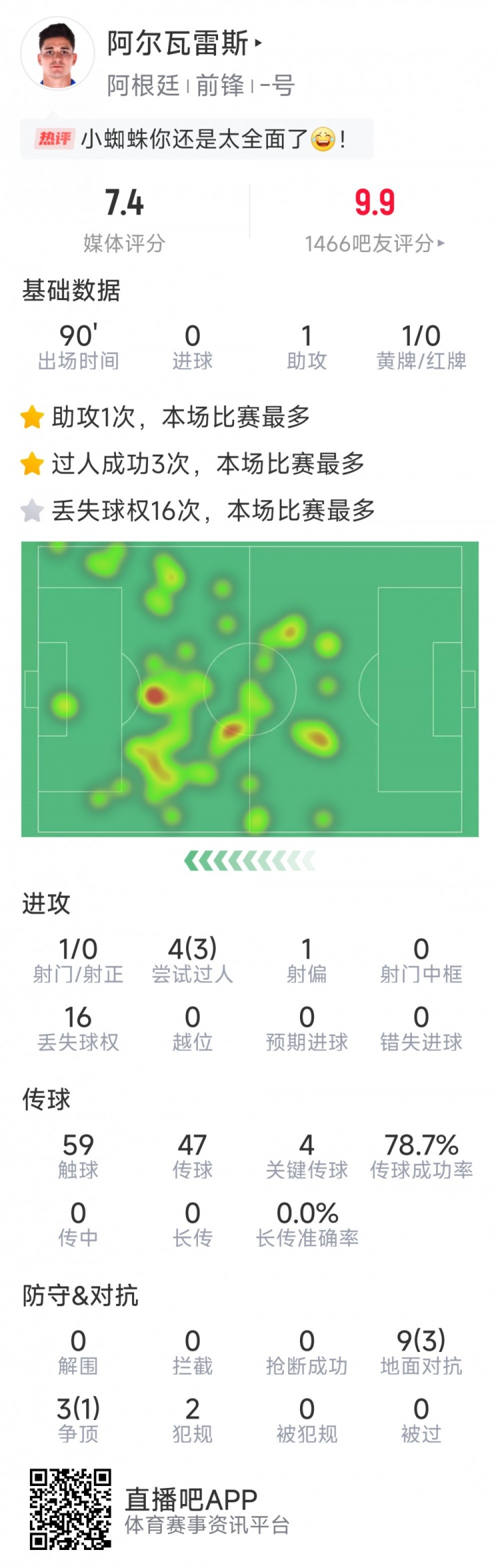 2025-03-22 10:09:27阿爾瓦雷斯本場數(shù)據(jù):1次助攻,4次關(guān)鍵傳球,3次成功過人