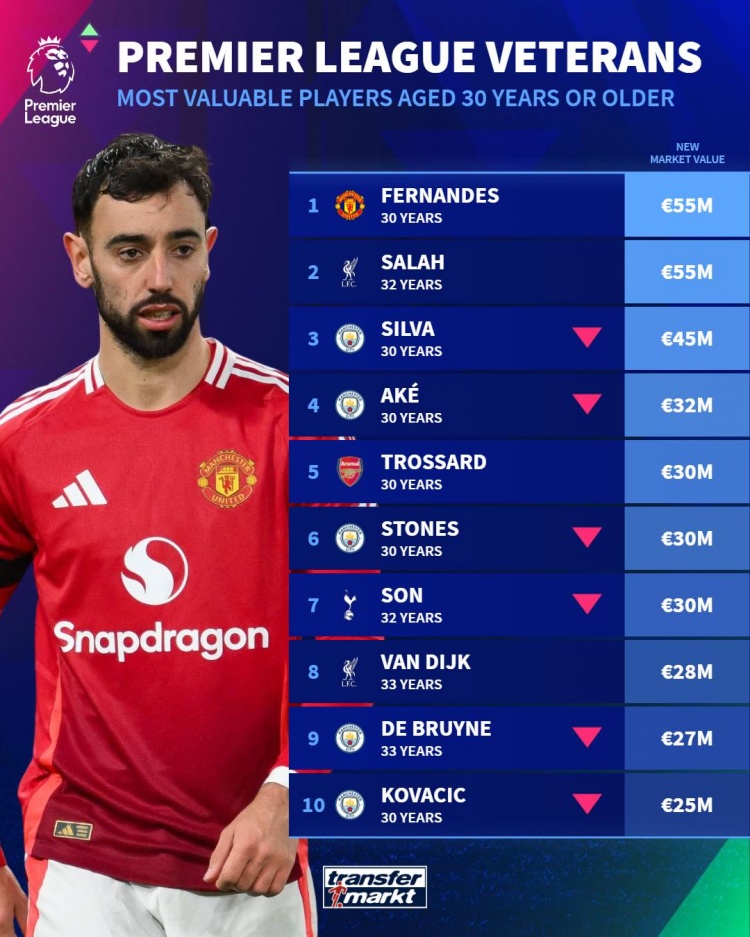 2025-03-23 17:47:48英超年齡30+球員身價(jià)榜:B費(fèi)、薩拉赫5500萬(wàn)歐居首,B席第三
