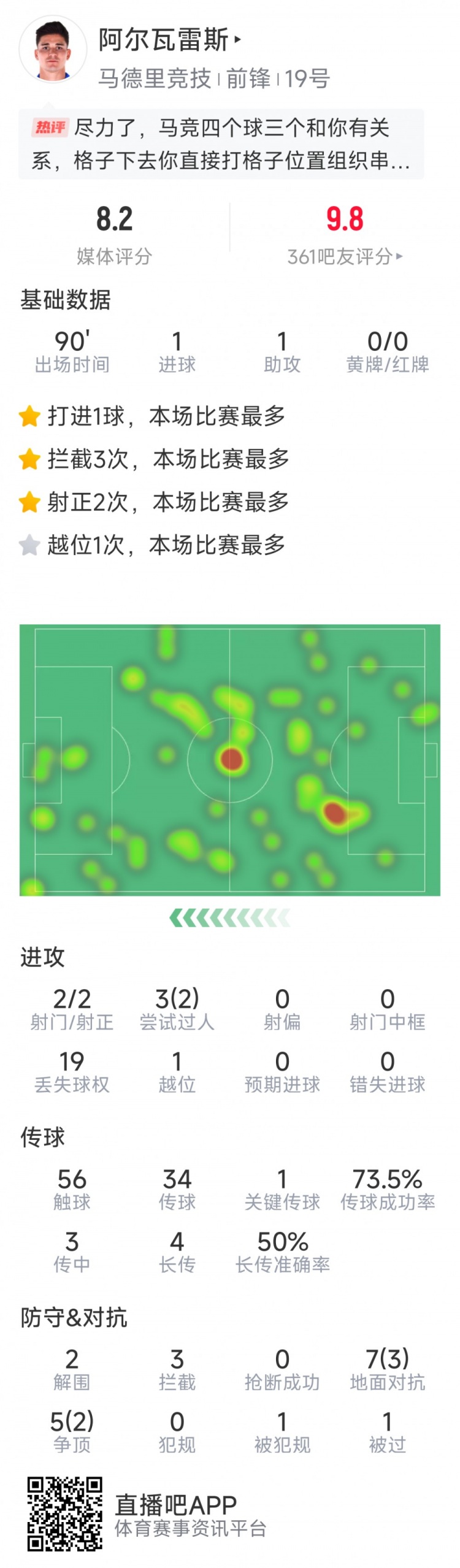 2025-02-26 08:09:11阿爾瓦雷斯本場數(shù)據(jù):傳射建功,2次射門均射正,3次攔截