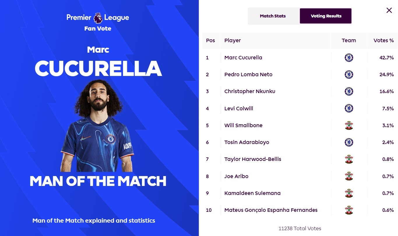2025-02-26 08:09:45攻防俱佳!庫(kù)庫(kù)雷利亞當(dāng)選切爾西4-0南安普頓全場(chǎng)最佳球員