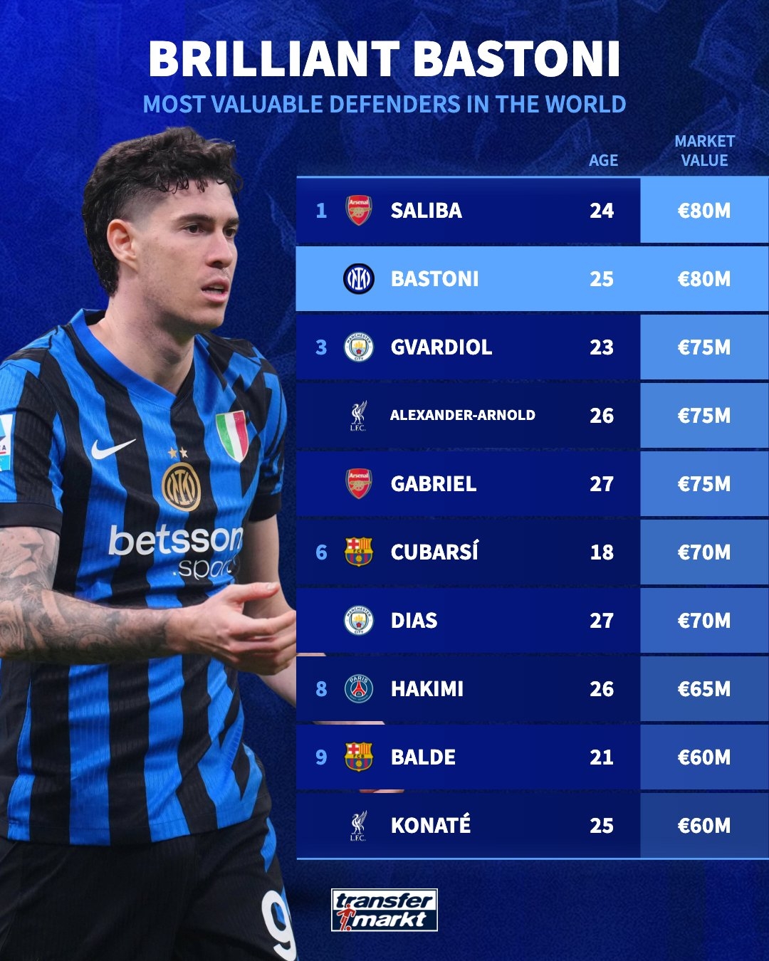 2025-03-26 20:49:33德轉(zhuǎn)最新后衛(wèi)身價top10:巴斯托尼8000萬歐,與薩利巴并列第1
