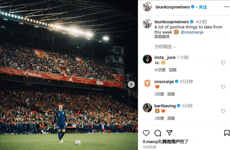 庫普梅納斯在社交媒體上寫道:“這一周發(fā)生了許多積極的事情?!闭б豢此坪跏菍δ陌抵S,但庫普梅納斯標注了荷蘭隊,并且配圖也是荷蘭國家隊的賽場照,因此可以認為他是在談論荷蘭的歐國聯(lián)之旅。