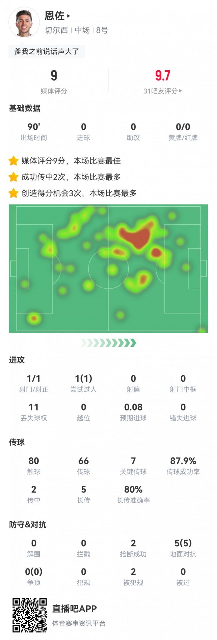 2025-02-26 08:09:55戰(zhàn)神!恩佐數(shù)據(jù):7次關(guān)鍵傳球,5次對(duì)抗全成功,評(píng)分9.0全場(chǎng)最高