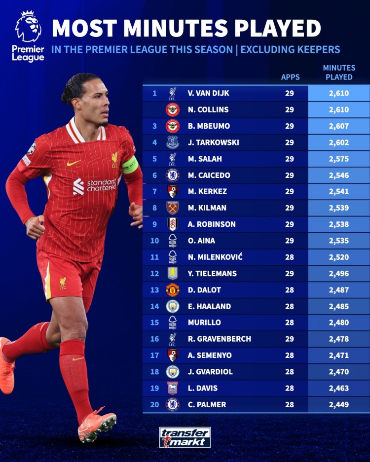 2025-03-27 08:48:35英超外場(chǎng)球員出場(chǎng)榜:范迪克打滿29場(chǎng)居首,薩拉赫第5、凱塞多第6