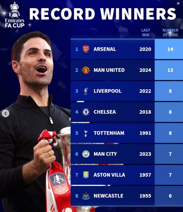 2025-03-30 20:23:14德轉列足總杯歷史奪冠榜:阿森納壓曼聯(lián)居首,曼城&維拉各7冠