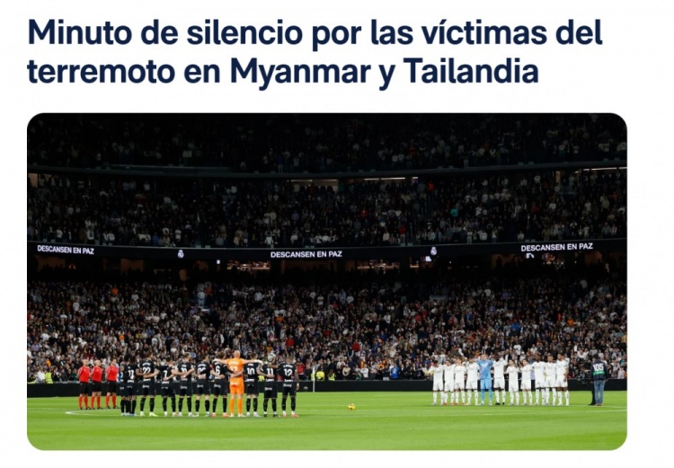 2025-03-30 20:25:44皇馬、萊加內(nèi)斯賽前列隊為緬甸、泰國地震遇難者默哀
