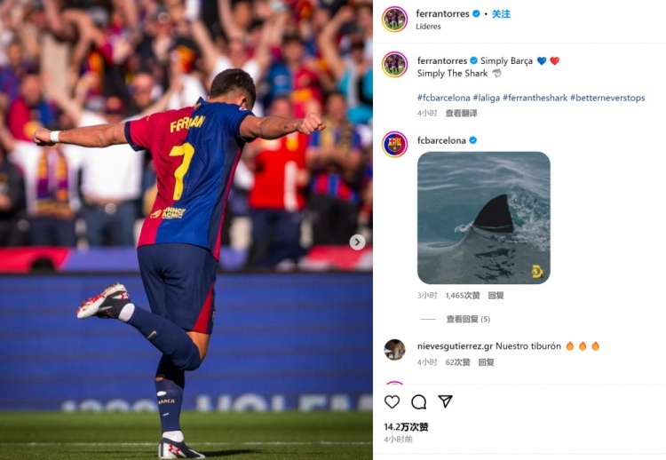 2025-03-31 10:15:31進(jìn)球停不下來(lái)!費(fèi)蘭-托雷斯社媒曬慶祝照:依然巴薩!依然鯊魚!