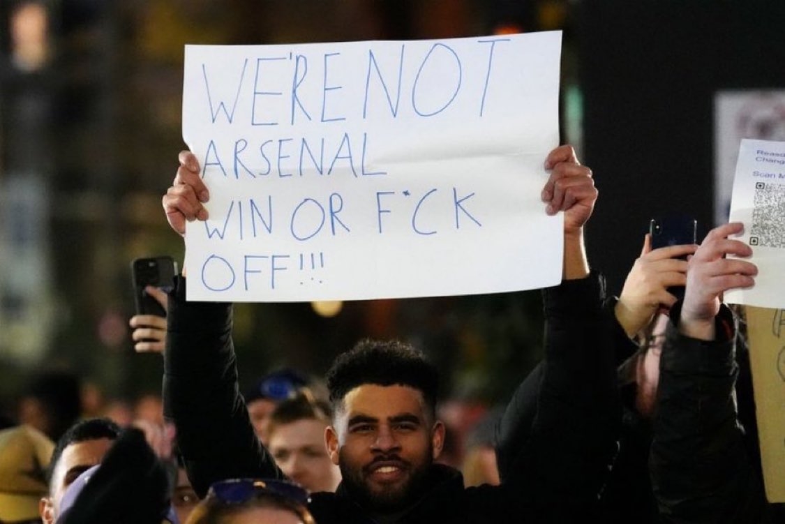 一名球迷的標(biāo)語(yǔ)上寫(xiě)著: “我們不是阿森納。要么贏,要么滾!”