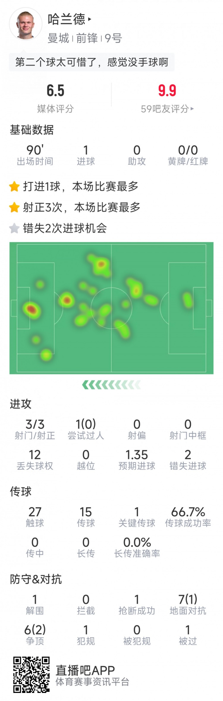 2025-02-27 08:10:46哈蘭德本場(chǎng)數(shù)據(jù):1粒進(jìn)球,3次射門(mén)均射正,2次錯(cuò)失良機(jī)